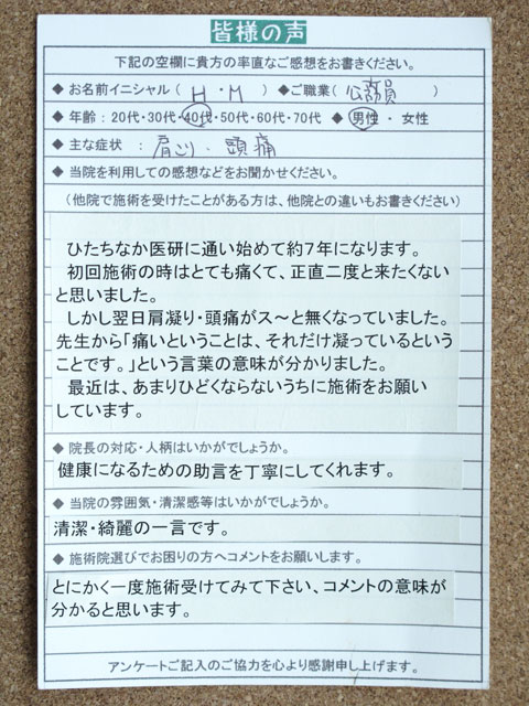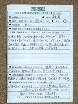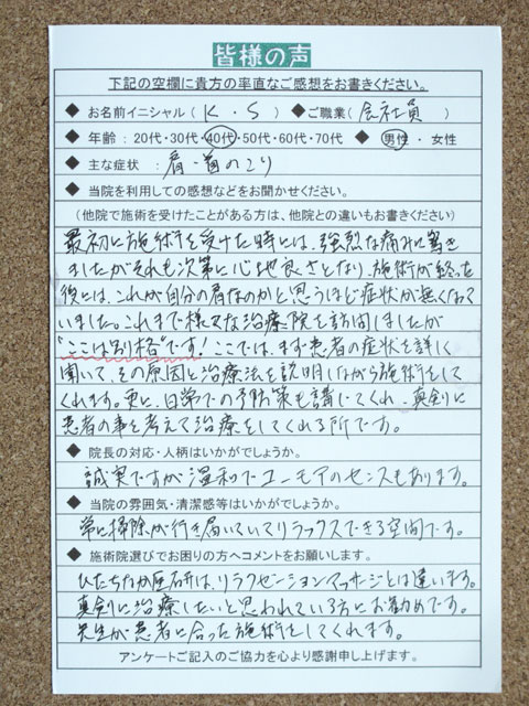 - 最初に施術を受けた時には、強烈な痛みに驚きましたが、そても次第に心地良さとなり、施術が終わった後には、これが自分の肩なのかと思うほど病状が無くなっていました。これまで様々な治療院を訪問しましたが“ここは別格”です!ここでは、まず患者の病状を詳しく聞いて、その原因と治療法を説明しながら施術をしてくれます。更に、日常での予防策も講じてくれ、真剣に患者のことを考えて治療をしてくれる所です。
