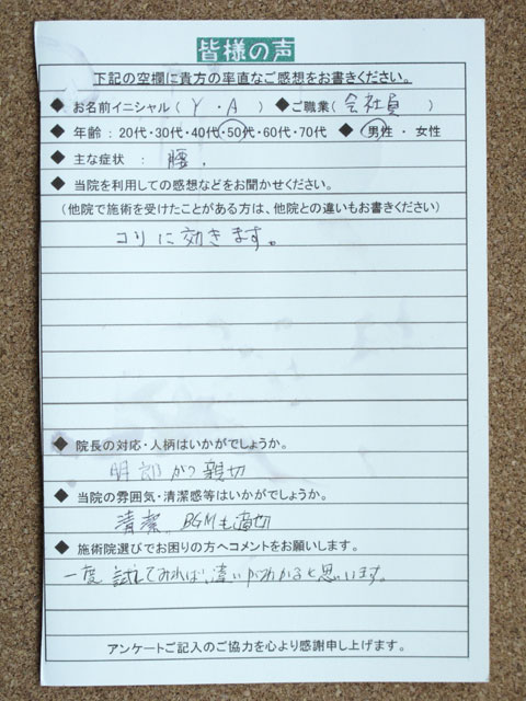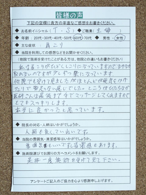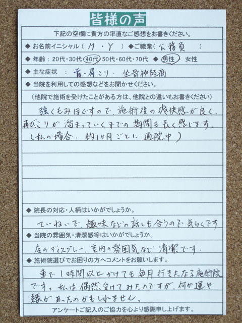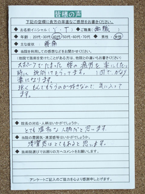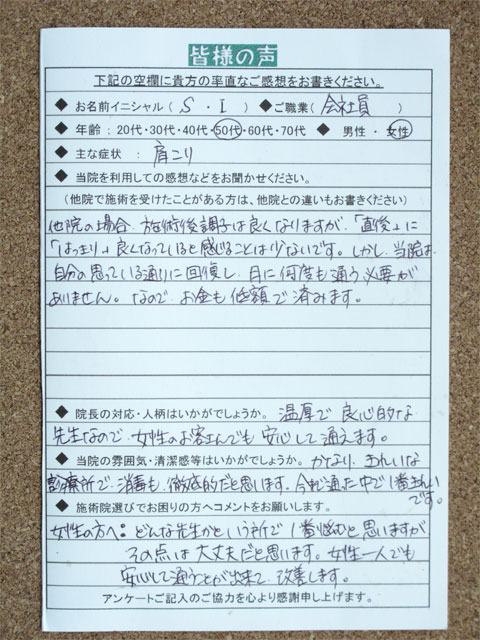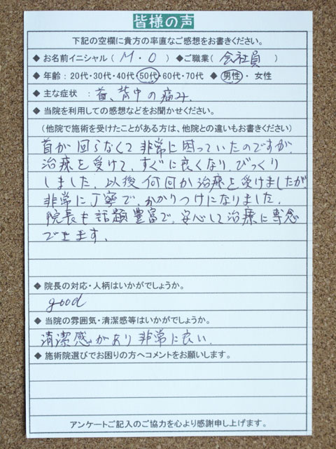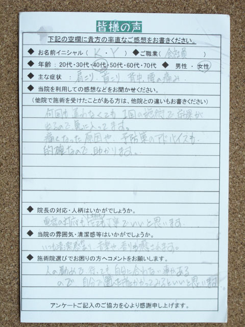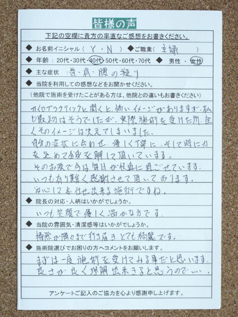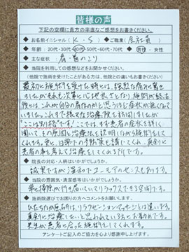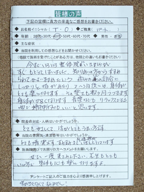 初めて訪れる整体院に対して、どなたでも不安な気持ちになるのは当然のことだと思います。貴方様の整体院選びの一つとして患者様の声をお役立ていただければ幸いです。